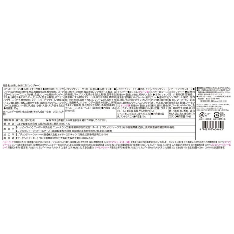 砂糖(タイ製造)、水あめ、ゼラチン、食用油脂/甘味料(ソルビトール)、酸味料、香料、ゲル化剤(ペクチン:オレンジ由来)、着色料(アントシアニン、クチナシ)