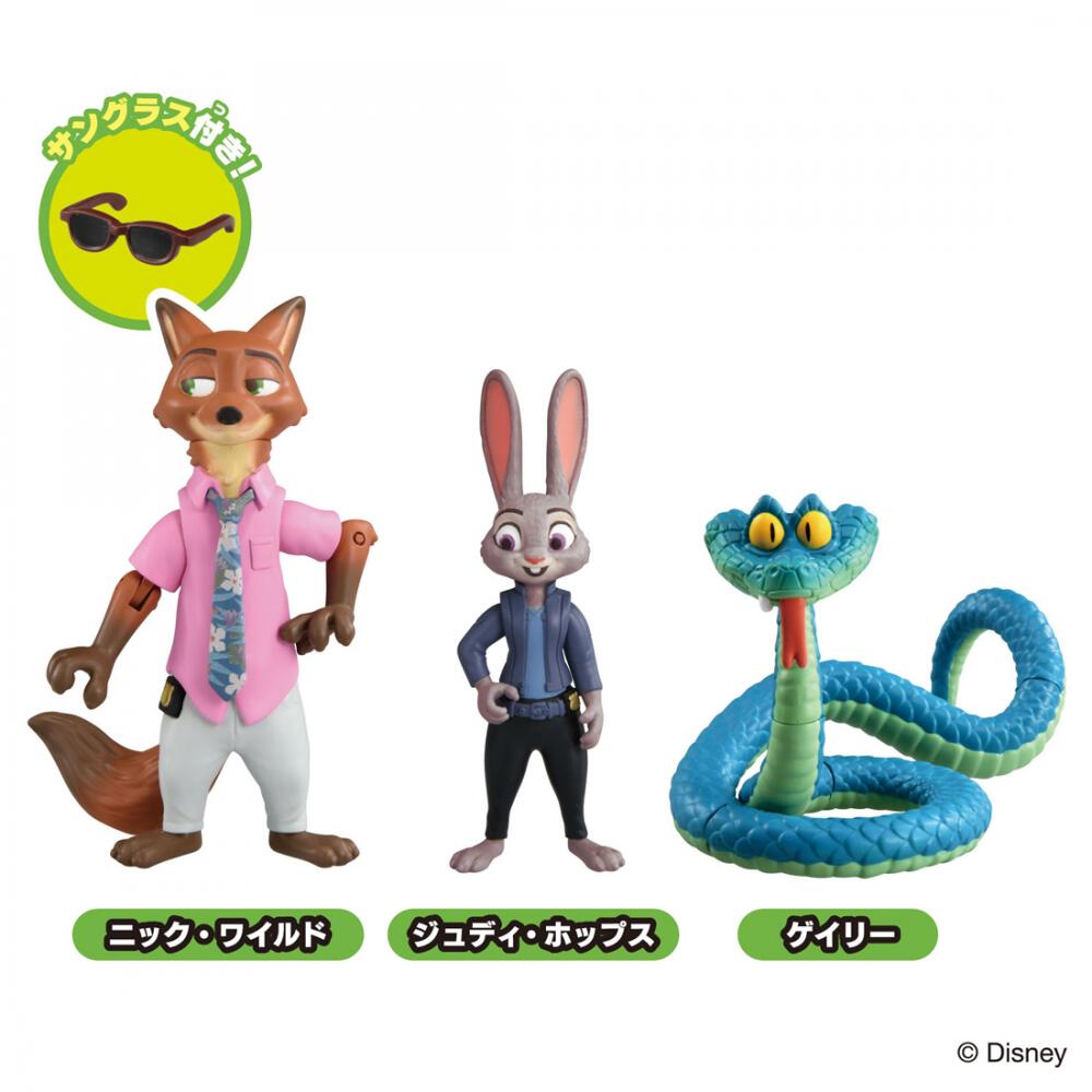 映画「ズートピア2」の動かして遊べるフィギュアのスペシャルセットがアニアで登場!映画「ズートピア2」に登場するニック、ジュディ、そして新キャラクターのゲイリーの動かして遊べるフィギュア3体セットです。・ジュディ・ホップスは首、腕が動きます・ニック・ワイルドは首、腕、しっぽが動きます。・ゲイリーはからだの5か所の関節が動きます。・ジオラマシートが付きます。<セット内容>ジュディ・ホップス(1),ニック・ワイルド(1),サングラス(1),ゲイリー(1),ジオラマシート(1)