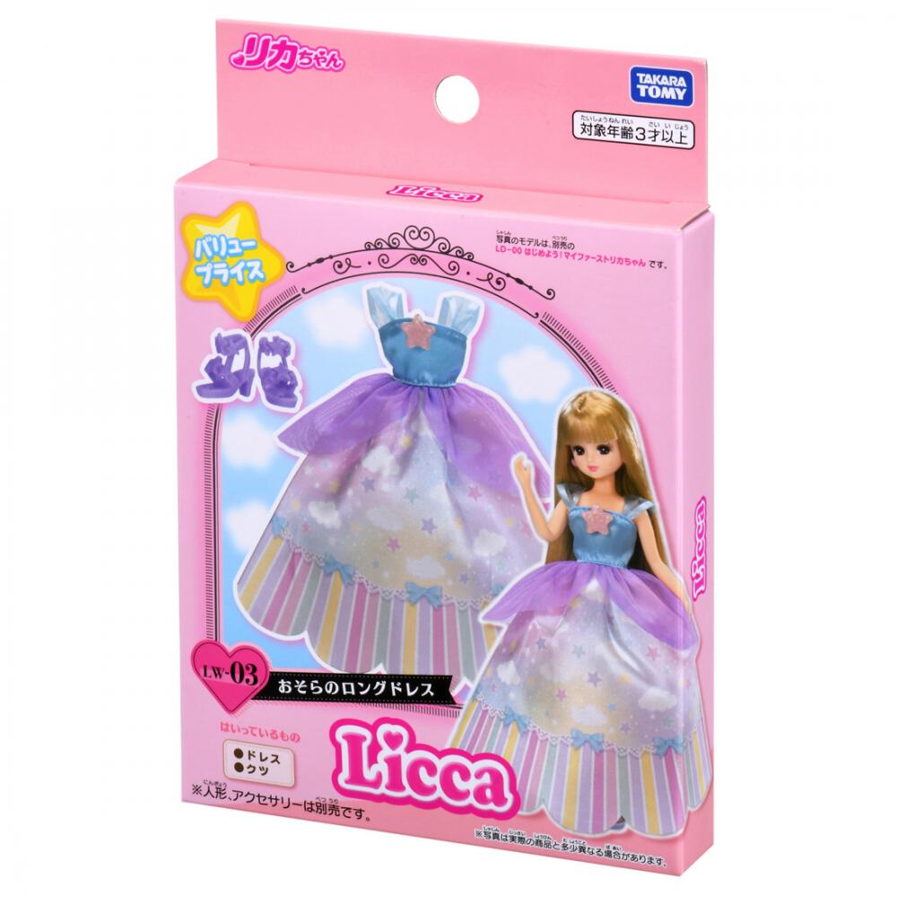 胸のお星さまがワンポイントのにじいろお空デザインがかわいいロングドレスです。パープルのスターサンダル付き。星がちりばめられたにじいろスカートのリカちゃんのロングドレスです。