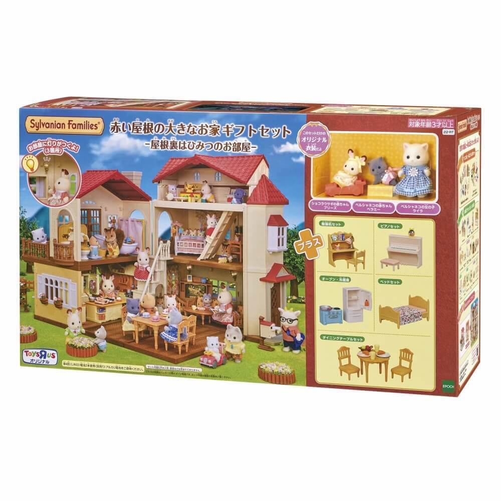 赤い屋根の大きなお家と、オリジナルカラーの家具、特別な洋服を着たペルシャネコの女の子、ペルシャネコの赤ちゃん(はいはい)、ショコラウサギの赤ちゃん(おすわり)のセットです。お家の屋根裏部屋には、はしごが飛び出すしかけつき!トイザらス限定のセットです。