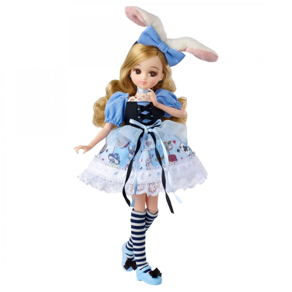 ふわふわのウサギの耳のカチューシャに、たっぷりとした袖やスカートがかわいい水色のワンピースはおとぎ話がテーマです。しましま模様のハイソックス、リボンのついたクツ、バッグ、ティーセットが付属します。