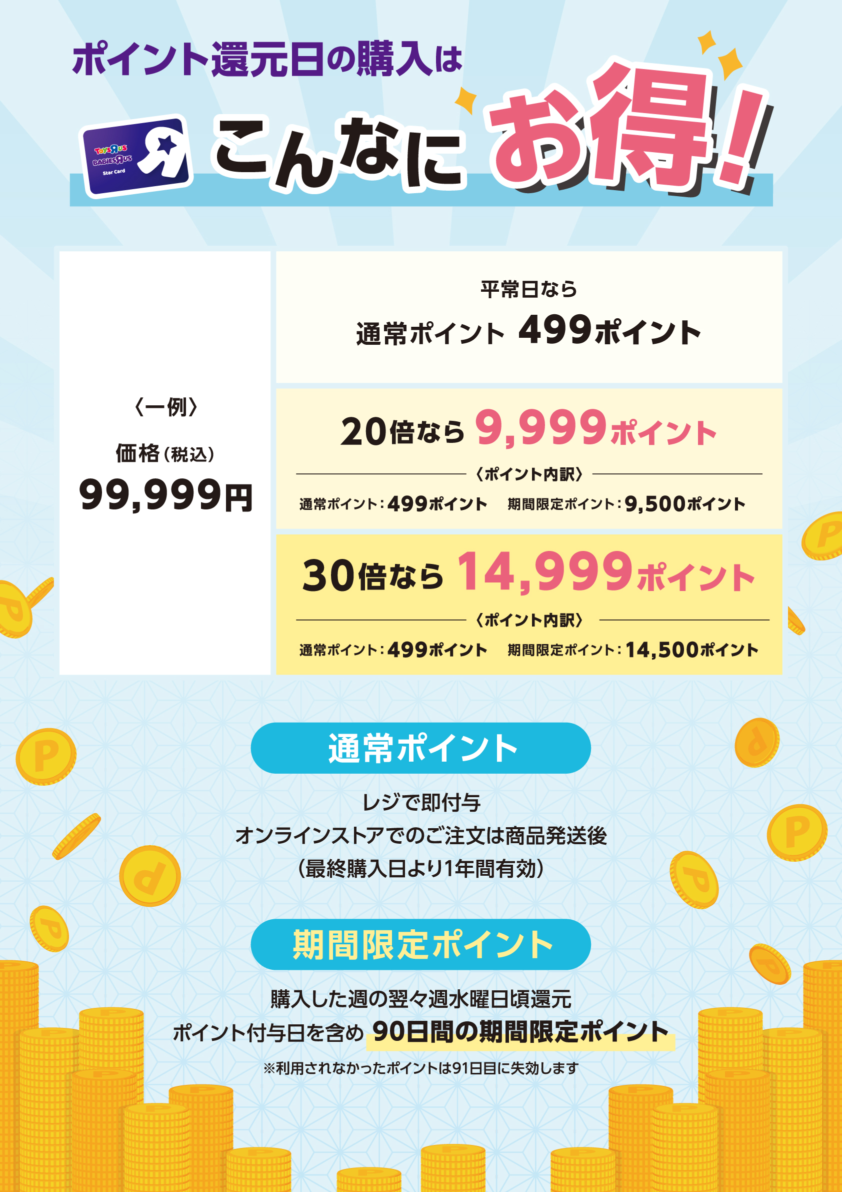 お会計(ご注文)時に付与される通常ポイント1倍分を差し引いたポイントが期間限定ポイントとして後日還元されます。