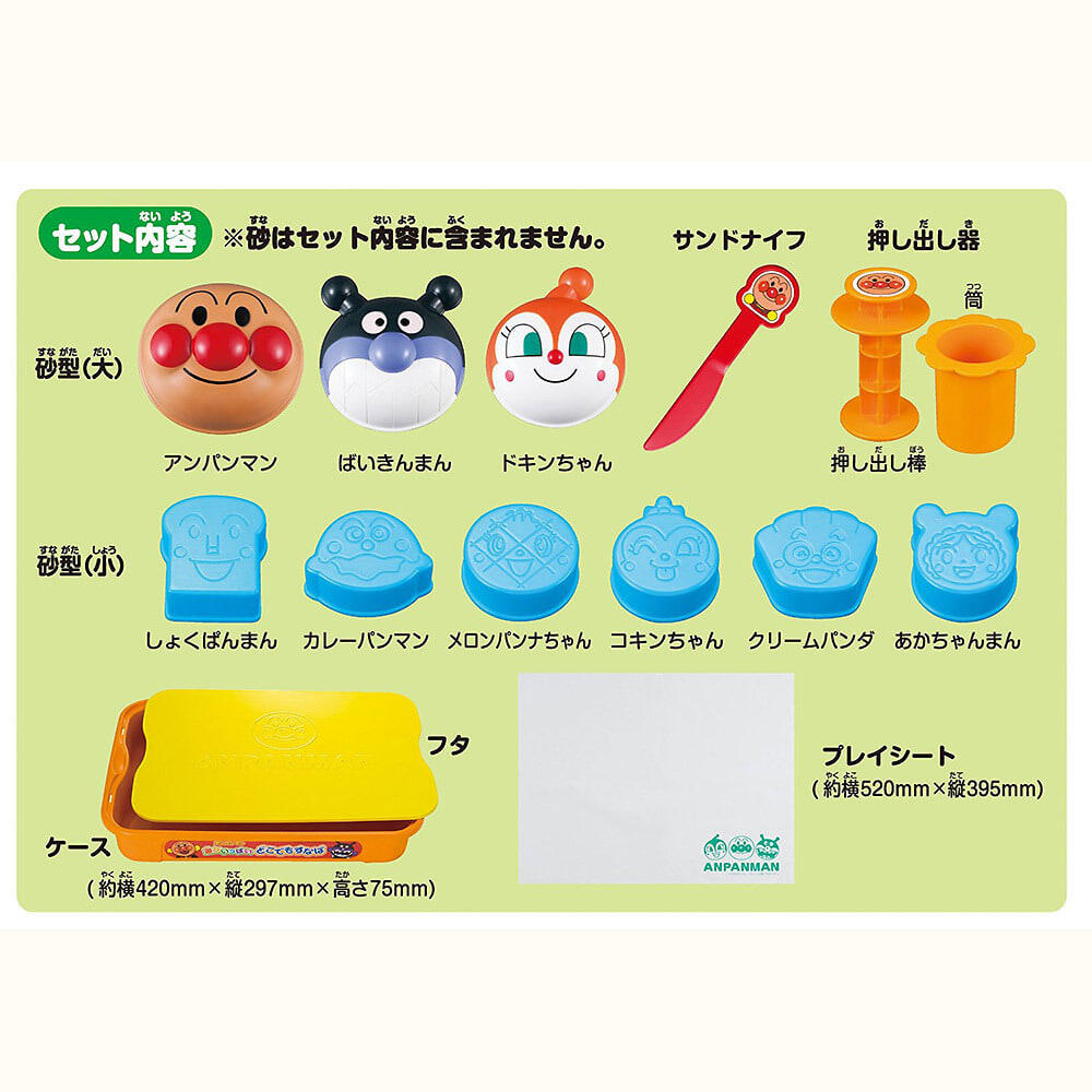●お子様の大好きなアンパンマン・ばいきんまん・ドキンちゃんの半立体の砂型が付いています。カレーパンマン・しょくぱんまん・あかちゃんまん・コキンちゃん・メロンパンナちゃん・クリームパンダのシルエットに顔が表現される砂型もついています。