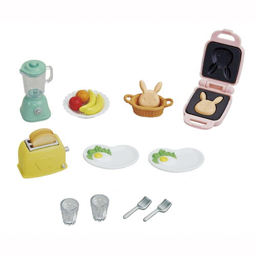 <セット内容>トースター、ホットサンドメーカー、ミキサー本体、カップ、フタ、モーニングプレート×2、皿、バスケット、フォーク×2、コップ×2、食パン×2、ホットサンド×2、バナナ×2、リンゴ、オレンジ (パーツ総数:21個)