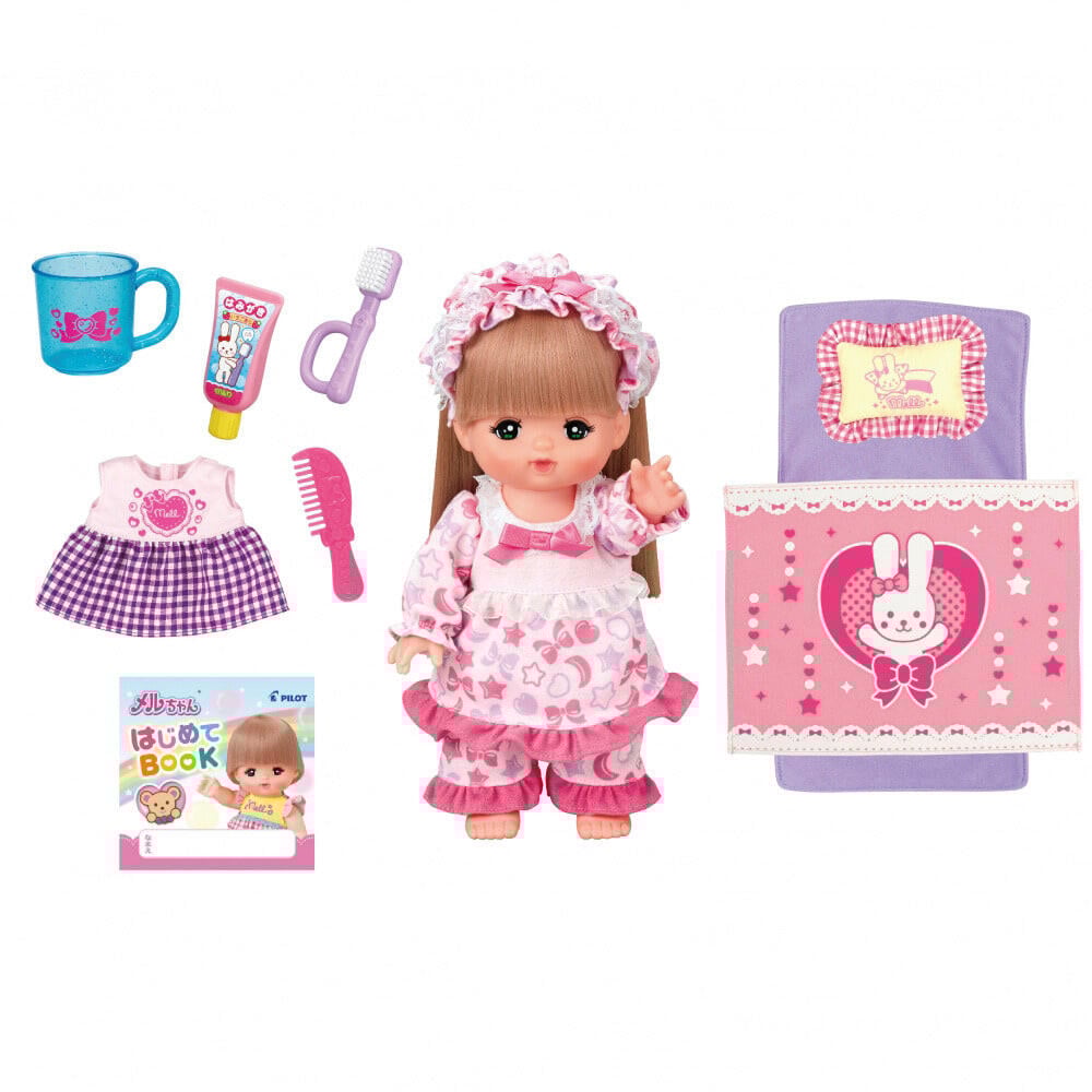 <セット内容>ロングヘアメルちゃん本体(パンツ付)、パジャマワンピース、パジャマズボン、ヘッドドレス、ワンピース、まくら、しきぶとん、ふとん、くし、