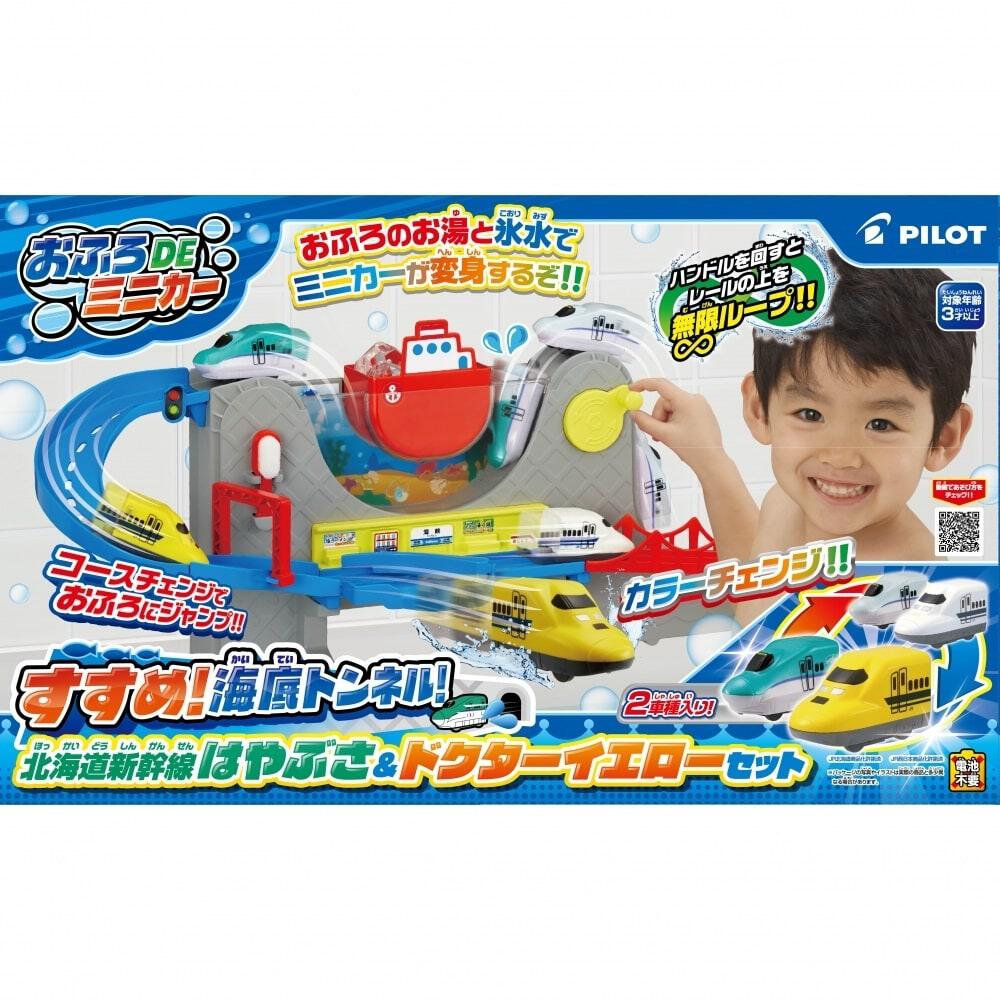 <セット内容>本体、ミニカー2台(北海道新幹線はやぶさ、ドクターイエロー)、スポンジツール、船、架線柱、つり橋、レール、耐水シールラベル