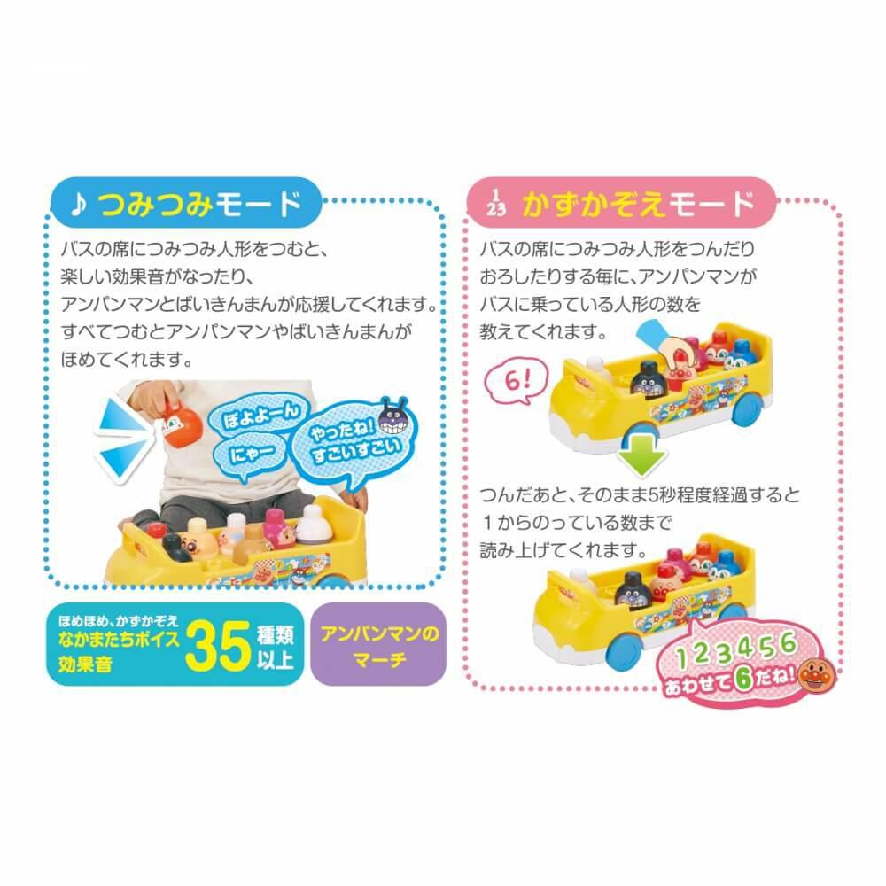 つみつみ人形をバスに乗せるとアンパンマンたちが応援してくれたり、数を数えてくれます。