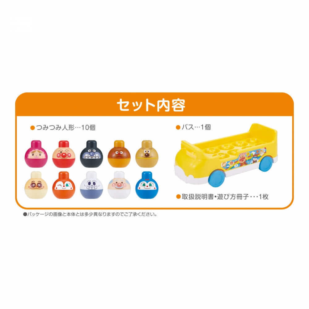 <セット内容>本体、つみつみ人形10個(アンパンマン、バイキンマン、ドキンちゃん、めいけんチーズ、カレーパンマン、クリームパンダ、ホラーマン、ジャムおじさん、コキンちゃん、あかちゃんまん)