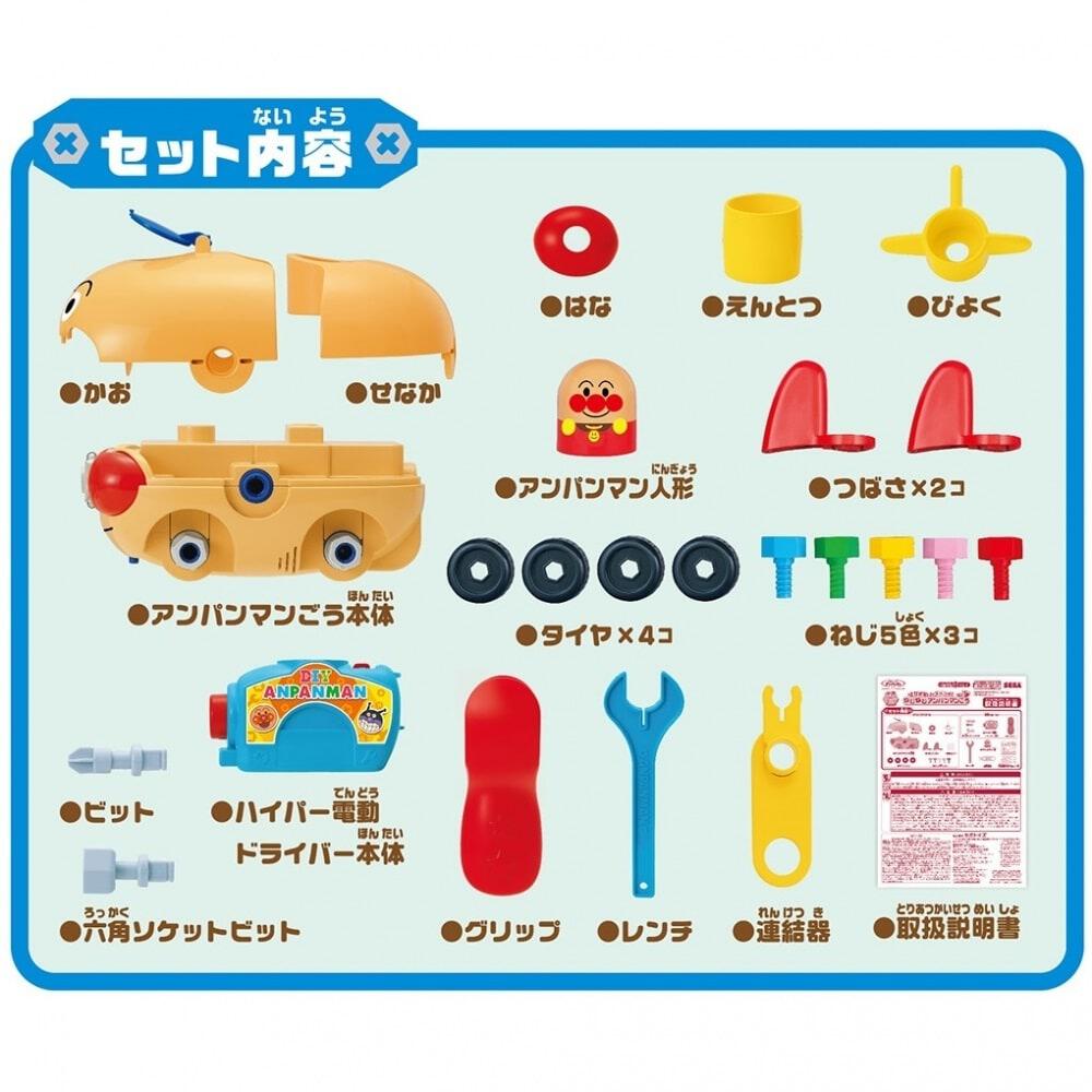 <セット内容>アンパンマンごう本体(9パーツ)、ひこうけい翼×3個、連結器×1個、ハイパー電動ドライバー(3パーツ(本体、グリップ、ビット))、レンチ×1個、ネジ×15個、六角ソケットビット×1、アンパンマン人形×1個