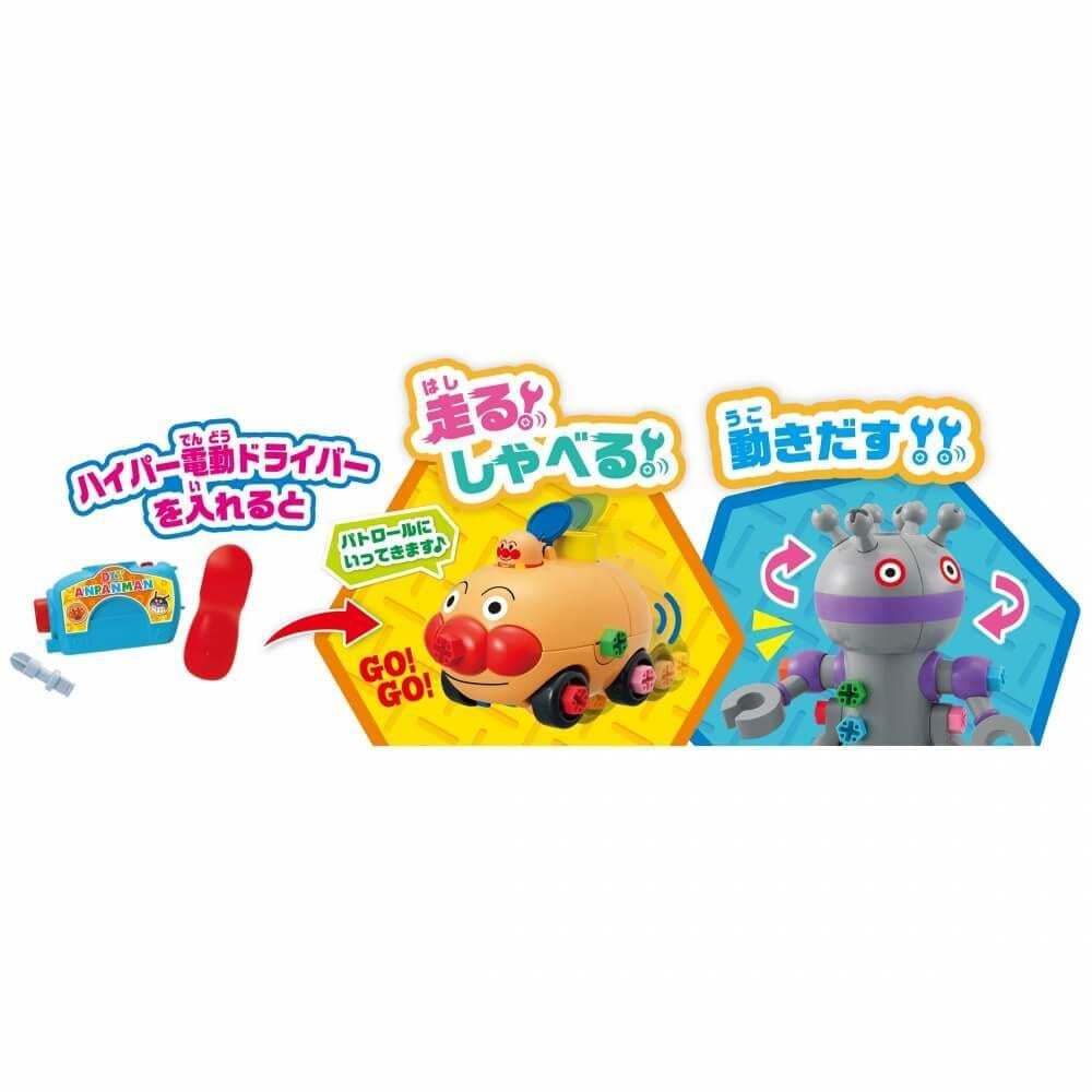 カスタマイズ部品である翼を付ければ、アンパンマンごうのひこうけいに!完成したアンパンマンごうは、ハイパー電動ドライバーを本体に挿入することで、おしゃべりやノーズパンチ、走らせて遊ぶことができます。