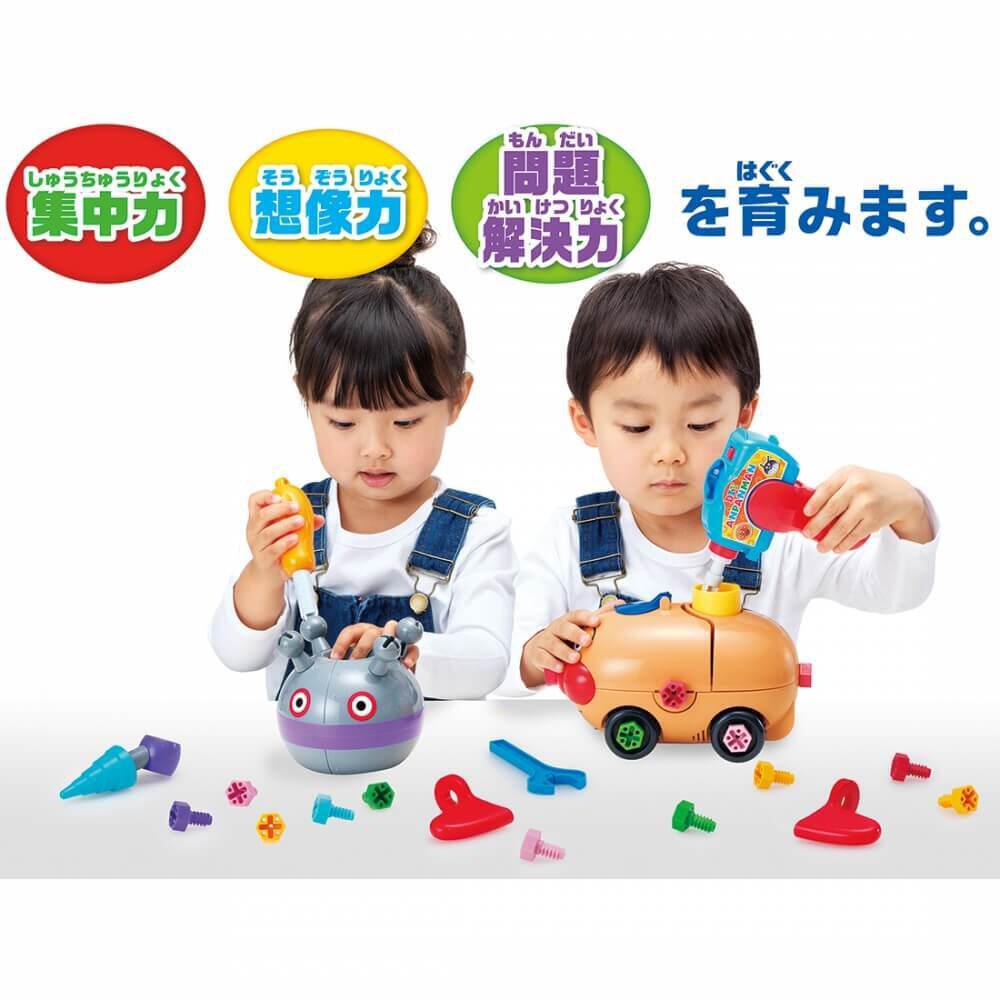 安心安全なお子様サイズのねじとハイパー電動ドライバー、レンチを使ってバラバラなパーツを組み立て、アンパンマンごうとだだんだんをつくっちゃおう♪