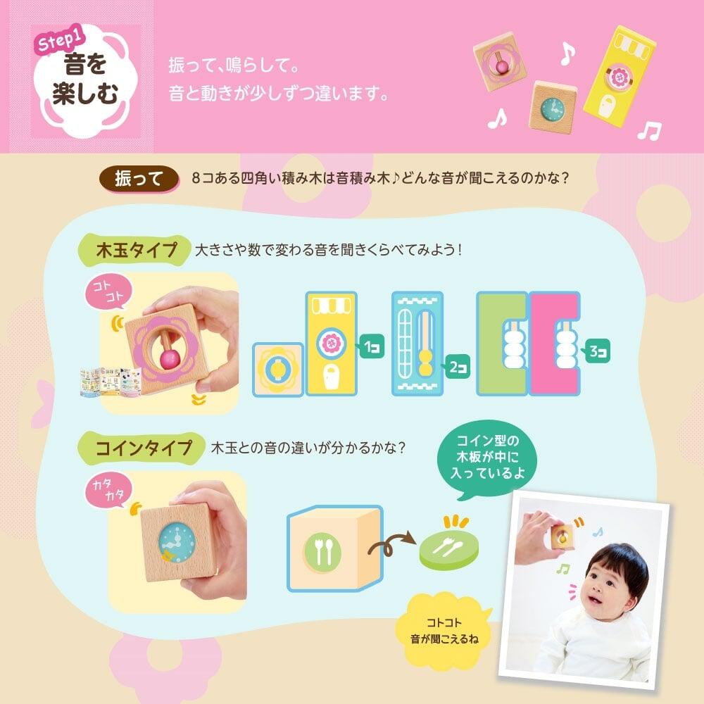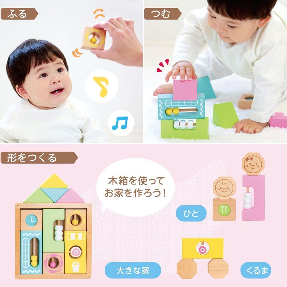 1歳からのおとつみき!14ピース入りです。8個のつみきが振ると音がします。