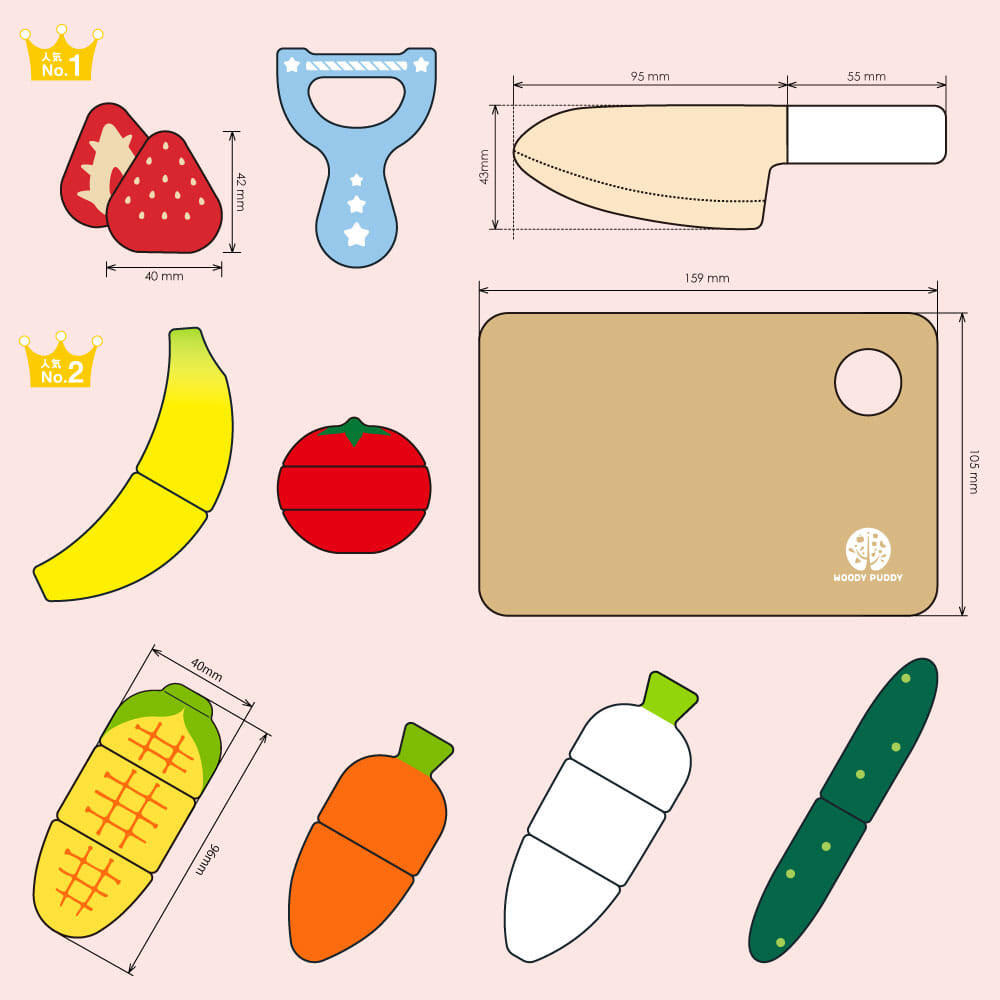 野菜5種にフルーツ2種の食材がたっぷりと入り、2つ切りや3つ切りまで思う存分に切る遊びが楽しめます。