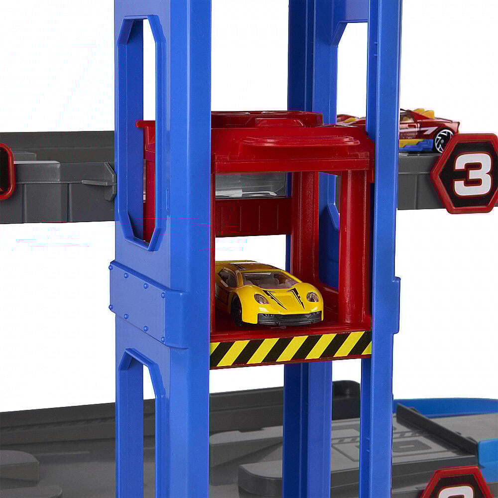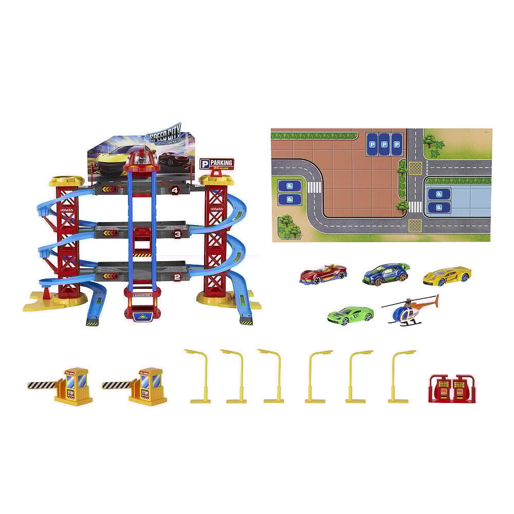 ・4階建てのパーキングガレージの最上部から、らせん状のスロープで上から下まで一気にミニカーを走らせる事が可能です。?また左右2か所スロープがありミニカーも4台ついているので、?兄弟、お友達とも楽しく遊ぶ事が出来ます。