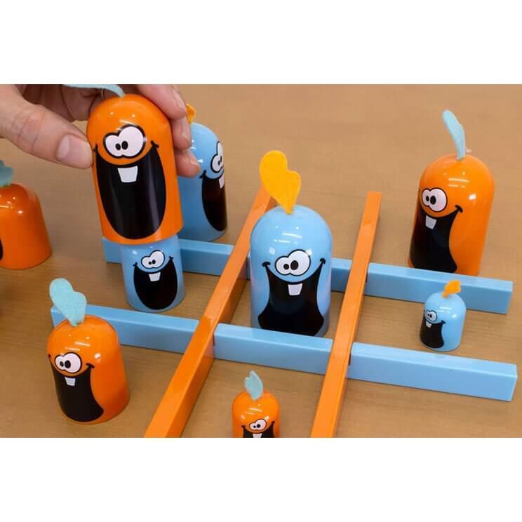 トサカが付いたキュートなゴブラーズ駒が可愛らしい、立体的な三目並べ、といった趣があるゲームです。囲碁や将棋など、理詰めで考えるタイプのゲームではありますが、「被せの中の駒が何だったか忘れてしまう」ことによる「あっ!」と驚くアクシデントがあって盛り上がります。