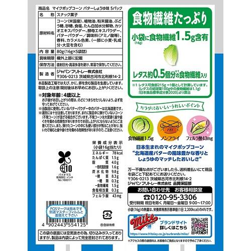 軽い食感のポップコーンに、北海道産バターの風味豊かな香りとしょうゆのマッチしたおいしさが楽しめます。食物繊維たっぷりで小分けになった小袋サイズの5パック入り。