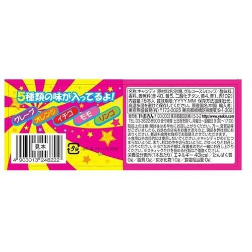 棒付きキャンディが15本、その名の通りDEKAいキャンディのような棒付きカプセル容器にグレープ、オレンジ、イチゴ、モモ、リンゴ、5種類の味が入っています。<内容量>150G(15本)<原材料に含まれるアレルギー物質>なし※コンタミネーション:なし<原材料名>砂糖、グルコースシロップ/酸味料、香料、着色料(赤40、黄5、二酸化チタン、黄4、青1、赤102)