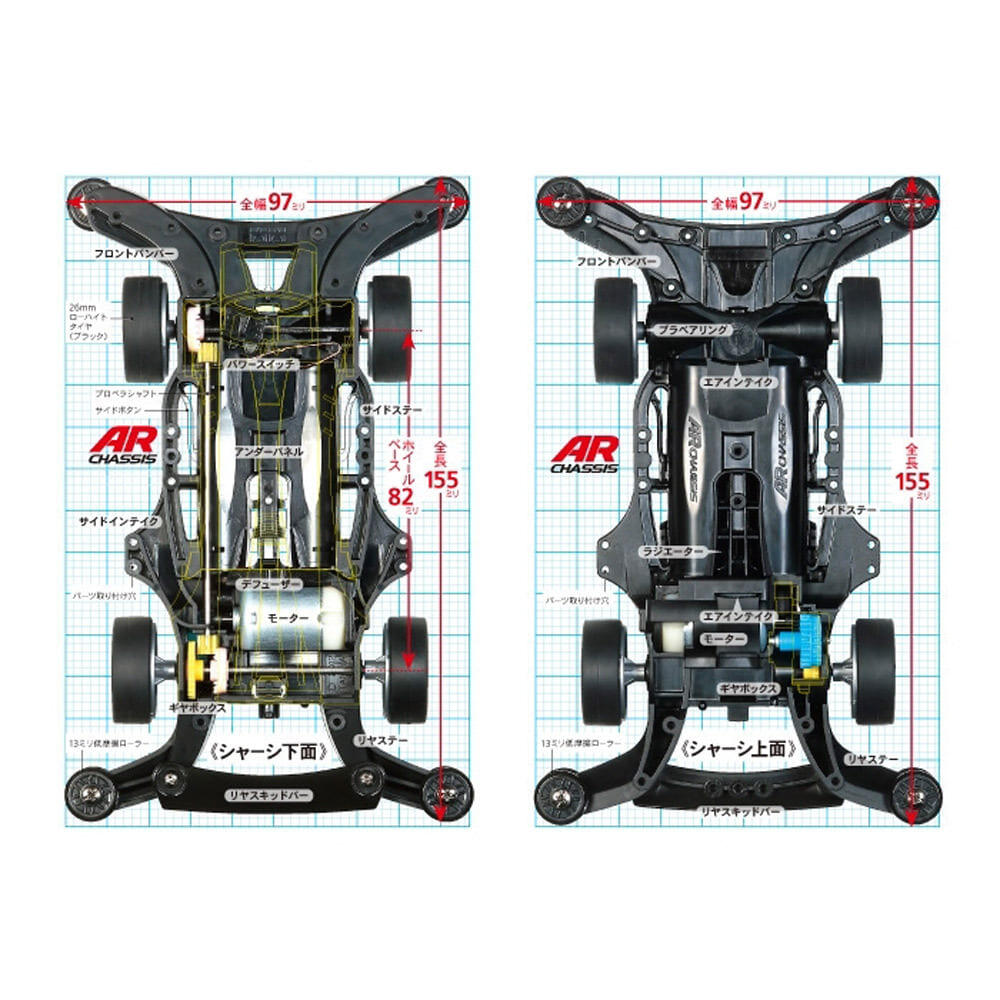 空力と整備性を徹底追求:空力の追求はもちろん、整備性や剛性、拡張性など、現代のミニ四駆レースに必要な要素をすべて兼ね備えたのがARシャーシ。アンダーパネルをはじめディフューザーはワンタッチで取り外しができます。