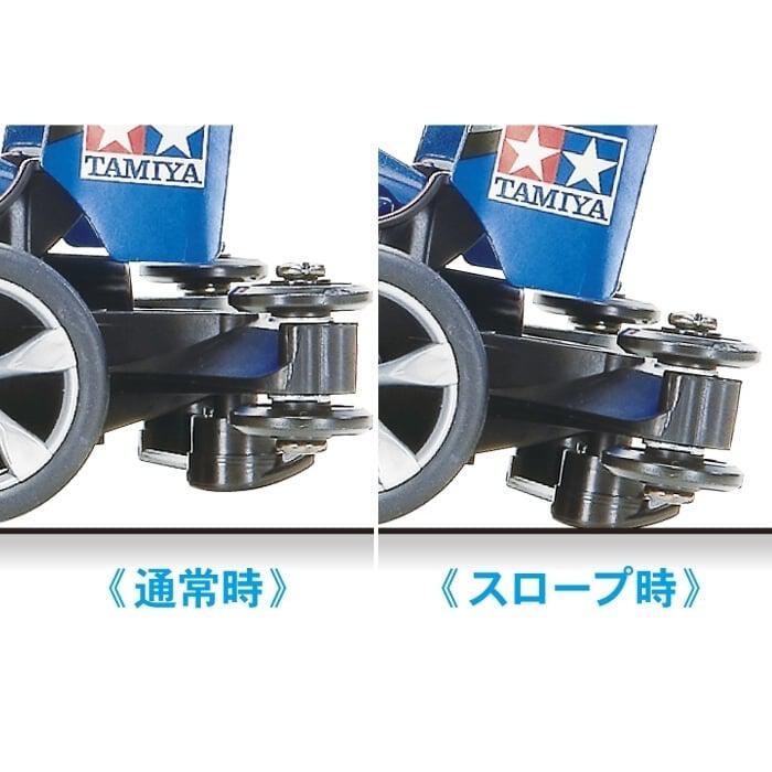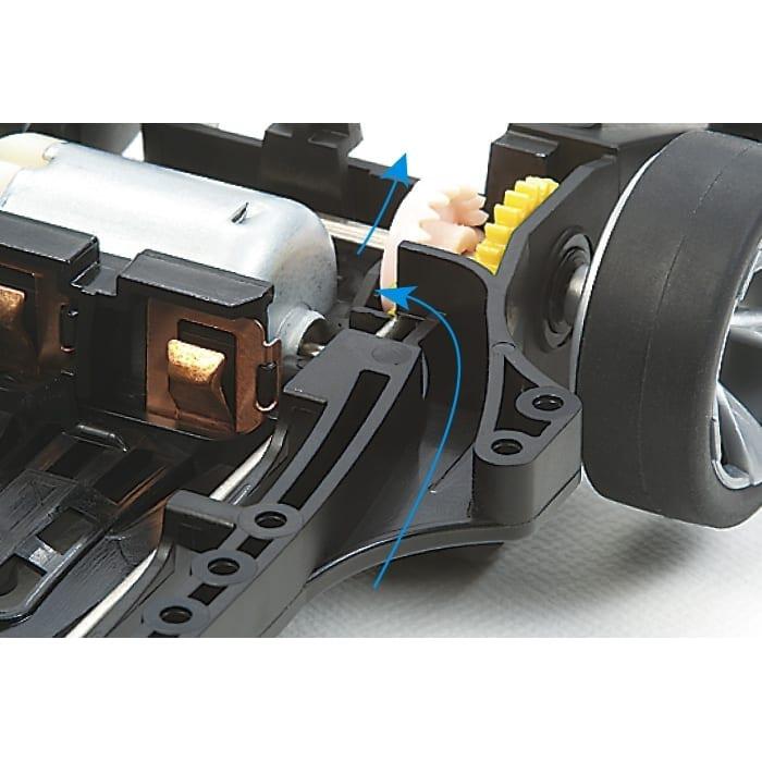リヤスキッドバー:スロープセクションなどの坂道コースを通過する時に、低摩擦樹脂のスキッドバーがコース路面と接触。マシンを減速させてコースアウトを防止します。また、ジャンプ後の着地などで乱れたマシンの姿勢を整える効果もあります。