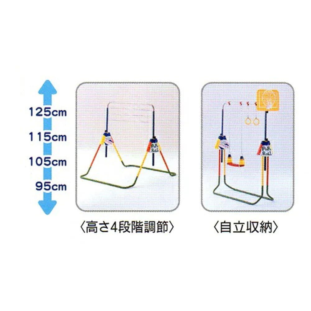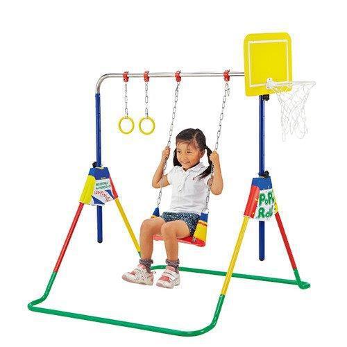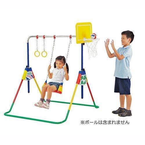 鉄棒・ブランコ・吊り輪・バスケットの4つの遊びをこの1台で体感することができ、鉄棒の高さは4段階調整が可能。