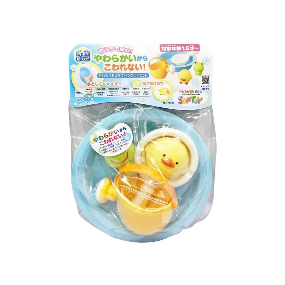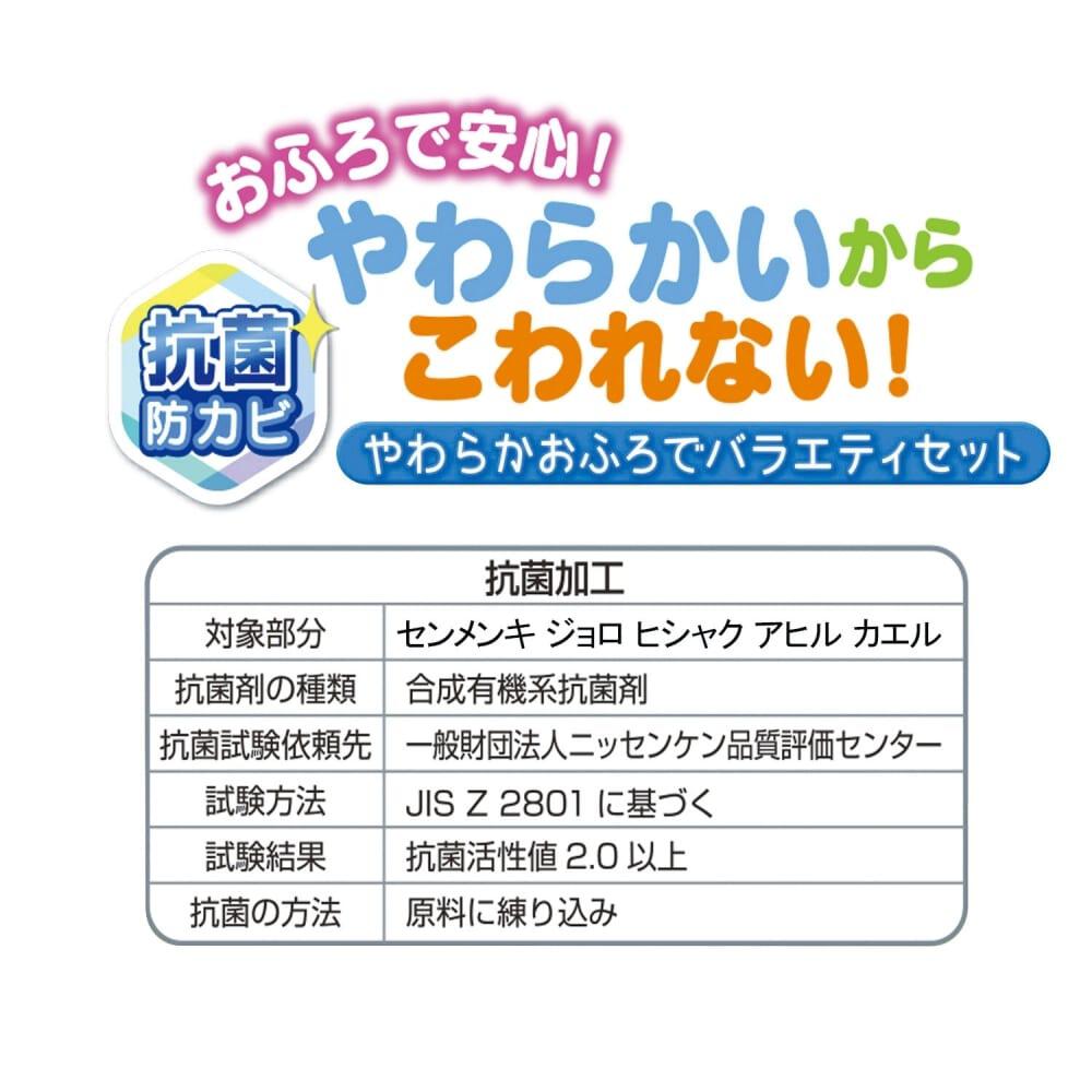 やわらかいから、落としても大丈夫!やわらかおふろでバラエティセットは、おふろでの遊びがさらに楽しくなるバラエティなアイテムです。やわらかヒシャクとやわらかせんめんき、やわらかミニジョロ、可愛らしいカエルさんとアヒルさんのみずてっぽう付き。