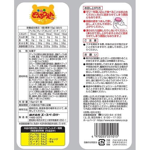 どうぶつのイラストがかわいい、アップル、グレープ、オレンジ、パイン、ピーチの5つの味の果汁50%(生果汁換算比)ゼリーです。