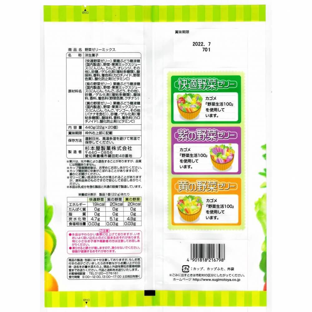 〔快適野菜ゼリー〕果糖ぶどう糖液糖(国内製造)、野菜・果実ミックスジュース(にんじん、りんご、オレンジ、その他)、砂糖/ゲル化剤(増粘多糖類)、酸味料、香料、着色料(カロチノイド、野菜色素)、酸化防止剤(ビタミンC)〔紫の野菜ゼリー〕果糖ぶどう糖液糖(国内製造)、野菜・果実ミックスジュース(にんじん、りんご、ぶどう、その他)、砂糖/ゲル化剤(増粘多糖類)、酸味料、香料、着色料(野菜色素、クチナシ)〔黄の野菜ゼリー〕果糖ぶどう糖液糖(国内製造)、野菜・果実ミックスジュース(にんじん、りんご、マンゴー、その他(バナナを含む))、砂糖/ゲル化剤(増粘多糖類)、酸味料、香料、着色料(カロチノイド)、酸化防止剤(ビタミンC)