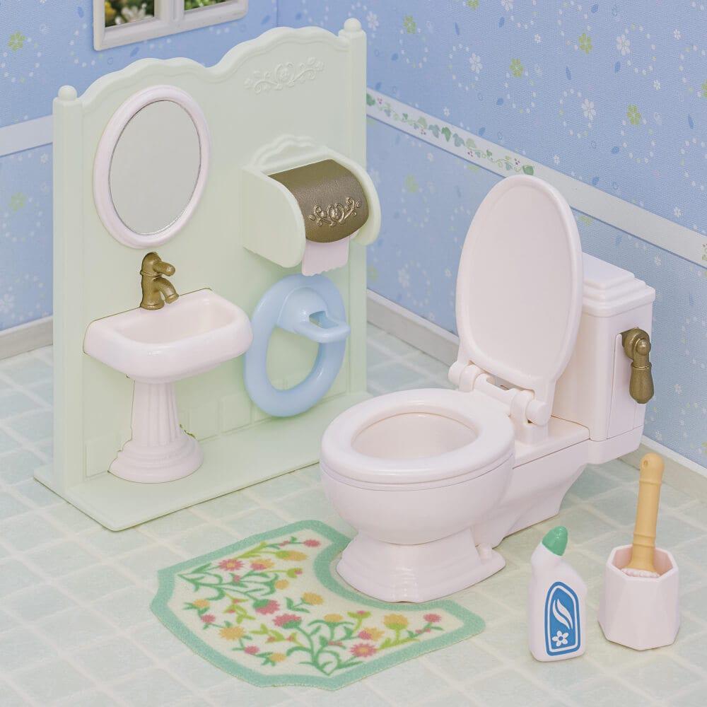 トイレ、手洗い台、おそうじ道具、赤ちゃん用便座、トイレマットなどがついたセットです。