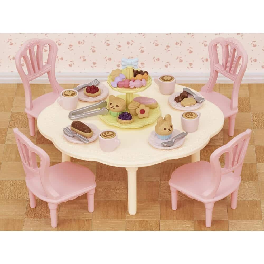 テーブル、いすx4、2段プレート、リボン、皿x4、フォークx4、トング、カフェラテ(ネコ)、カフェラテ(ペンギン)、カフェラテ(クローバー)、カフェラテ(チューリップ)、コップx4、カップケーキ(ウサギ)、カップケーキ(クマ)、エクレア(チョコ)、エクレア(ストロベリー)、タルト(ストロベリー)、タルト(ブルーベリー)、クッキー(どんぐり)、クッキー(クローバー)、クッキー(お家)、クッキー(お花)、チョコレートx2、キャンディ(ストロベリー)、キャンディ(ピーチ)、キャンディ(オレンジ)、キャンディ(グレープ)