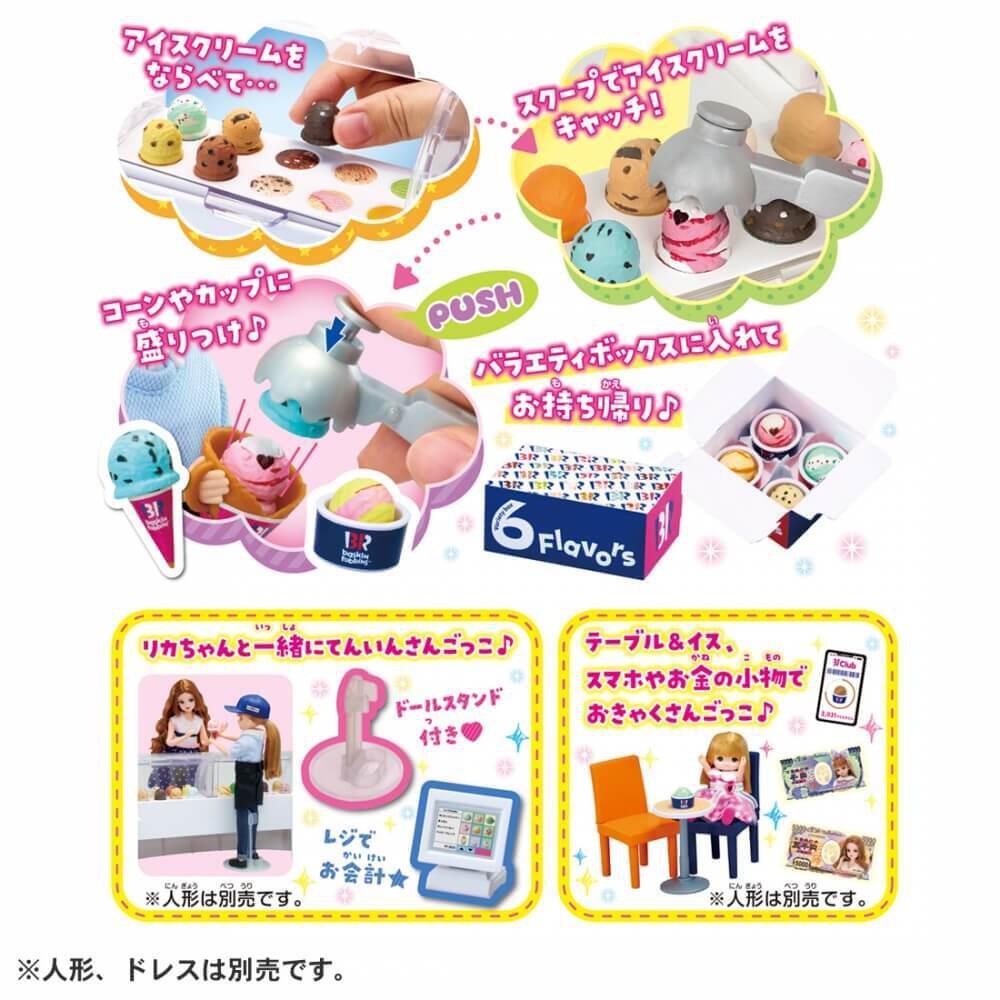 スクープでアイスクリームをすくってコーンやカップに盛りつけ!アイスがいっぱい♪リカちゃんサイズのサーティワン アイスクリームショップです。