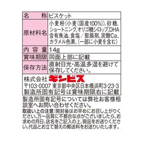小麦粉(小麦(国産100%))、砂糖、ショートニング、オリゴ糖シロップ、DHA含有魚油、食塩/膨脹剤、炭酸Ca、カラメル色素、(一部に小麦を含む).