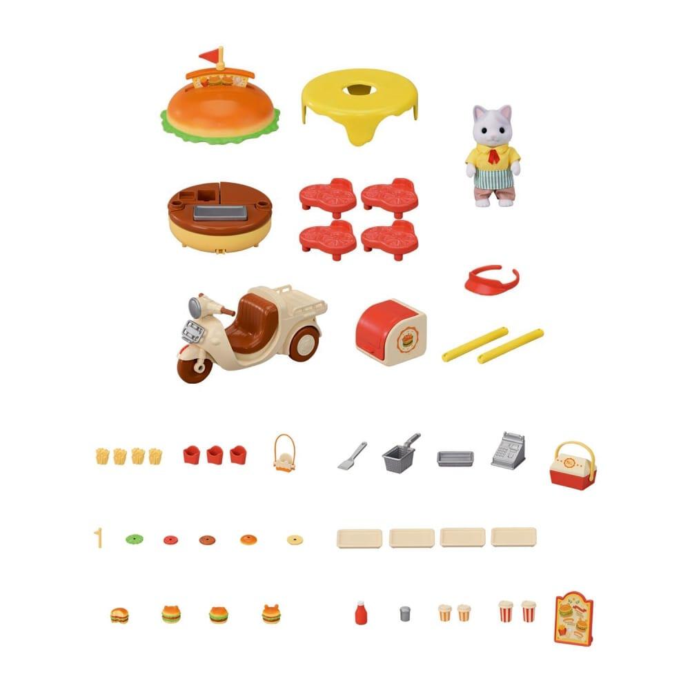 ハンバーガーのかたちをしたお店とデリバリーバイク、お人形のセットです。
