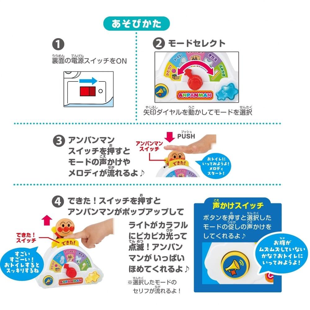 モードごとに楽しいメロディとアンパンマンの声かけが流れて、お子さまのやる気を後押ししてくれるよ!