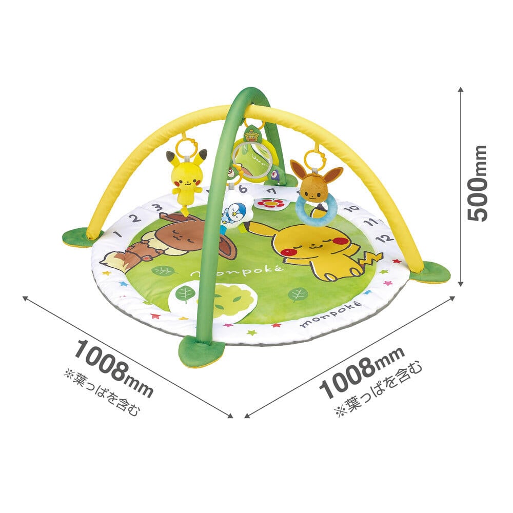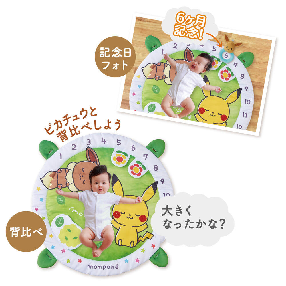 月齢に合わせての記念日フォトやピカチュウとの背比べも!ピカチュウ、イーブイ、ポッチャマ、なかまたちの4種類の飾りは取り外してぬいぐるみとしても遊べます♪