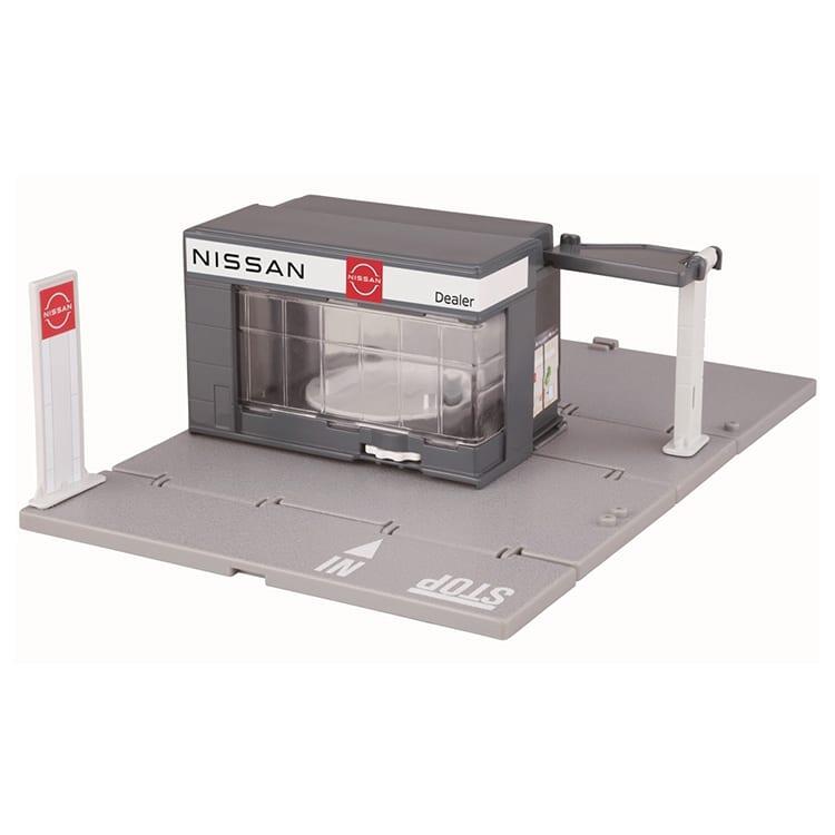 パッと開いてすぐに遊べるトミカタウンにNISSAN カーディーラーが登場!日産 スカイライン付き!店舗内部にターンテーブルのあるカーディーラーです。ダイヤルを手動で回すことでターンテーブルに飾ったトミカが回転し、ショールームのように遊ぶことができます。組み立て、ラベル貼り不要で本体をパッと開くとすぐに遊べます。また遊ばないときは折りたたんでコンパクトに収納が可能です。※セット内容以外のトミカは別売りです。<セット内容>NISSAN カーディーラー(1),日産 スカイライン(1)
