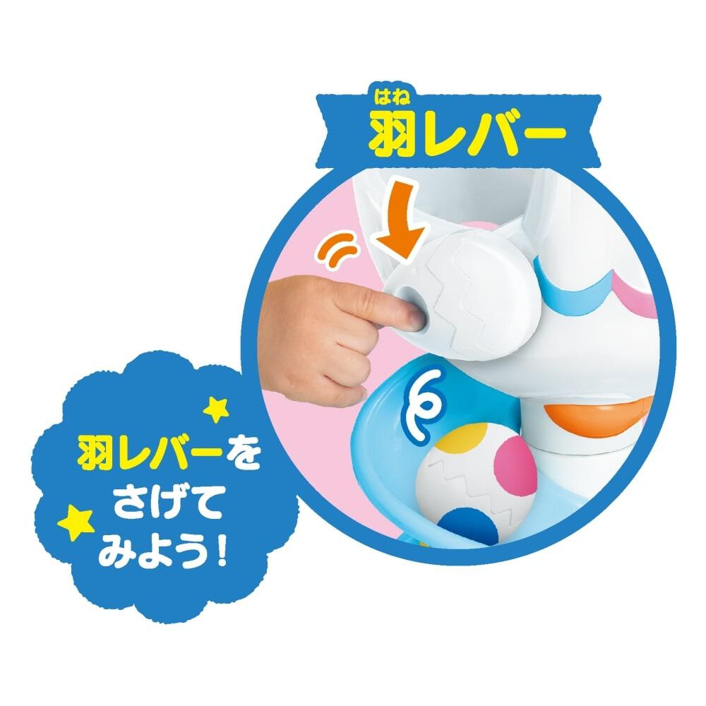 にわとりさんにたまごを入れて羽レバーを下げるとポン!とたまごが出てきて、パタパタゲートを通りながらスロープを転がります。