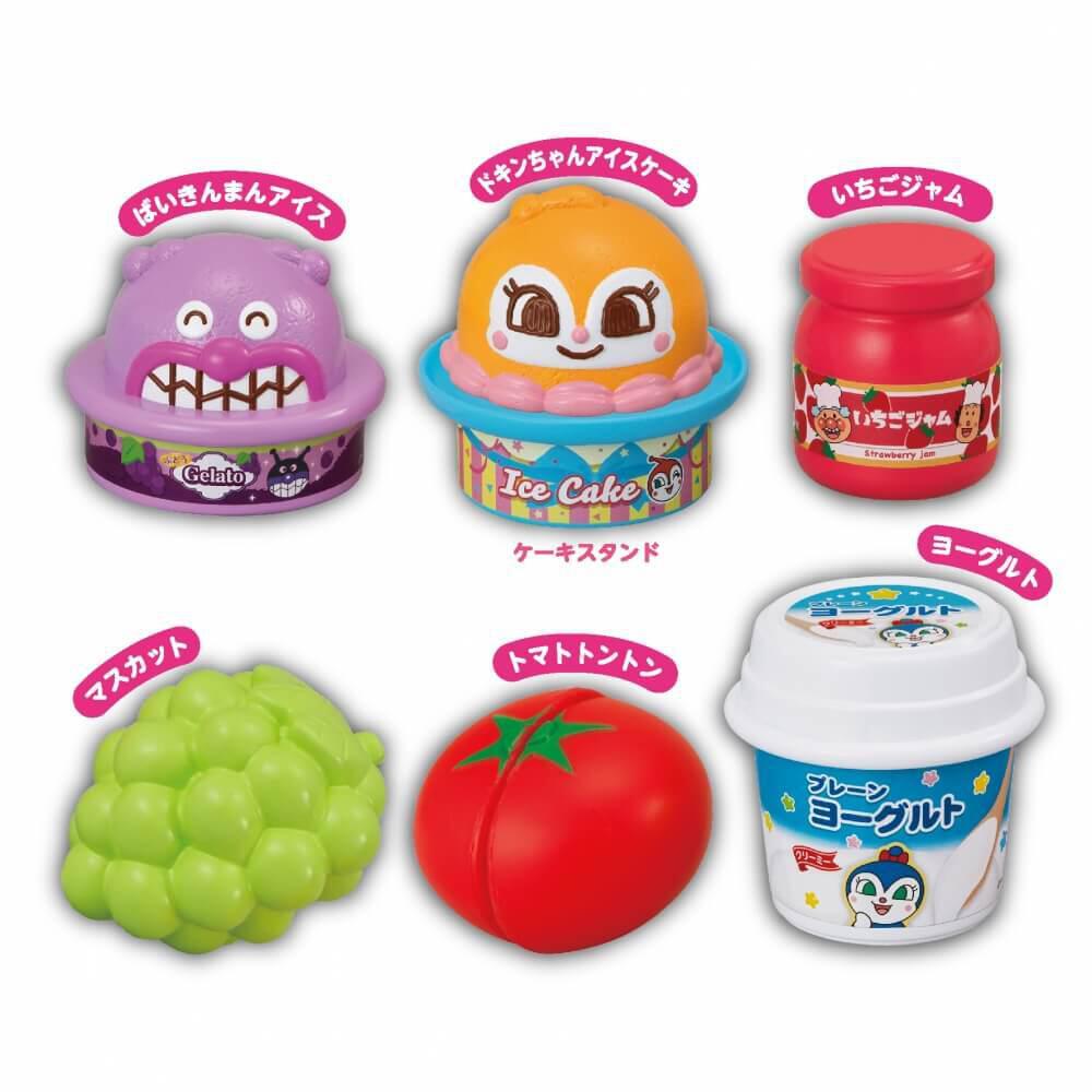 本体、ひきだし、棚板×2枚、マスカット、トマトトントン、ドキンちゃんアイスケーキ、ケーキスタンド、ばいきんまんアイス、ヨーグルト、いちごジャム、スポイト