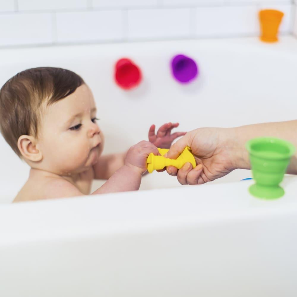 重ねたり、たたんだり、つぶしたり、くっつけたり、水をそそいだり!色々遊べるカラフルなカップのセット。
