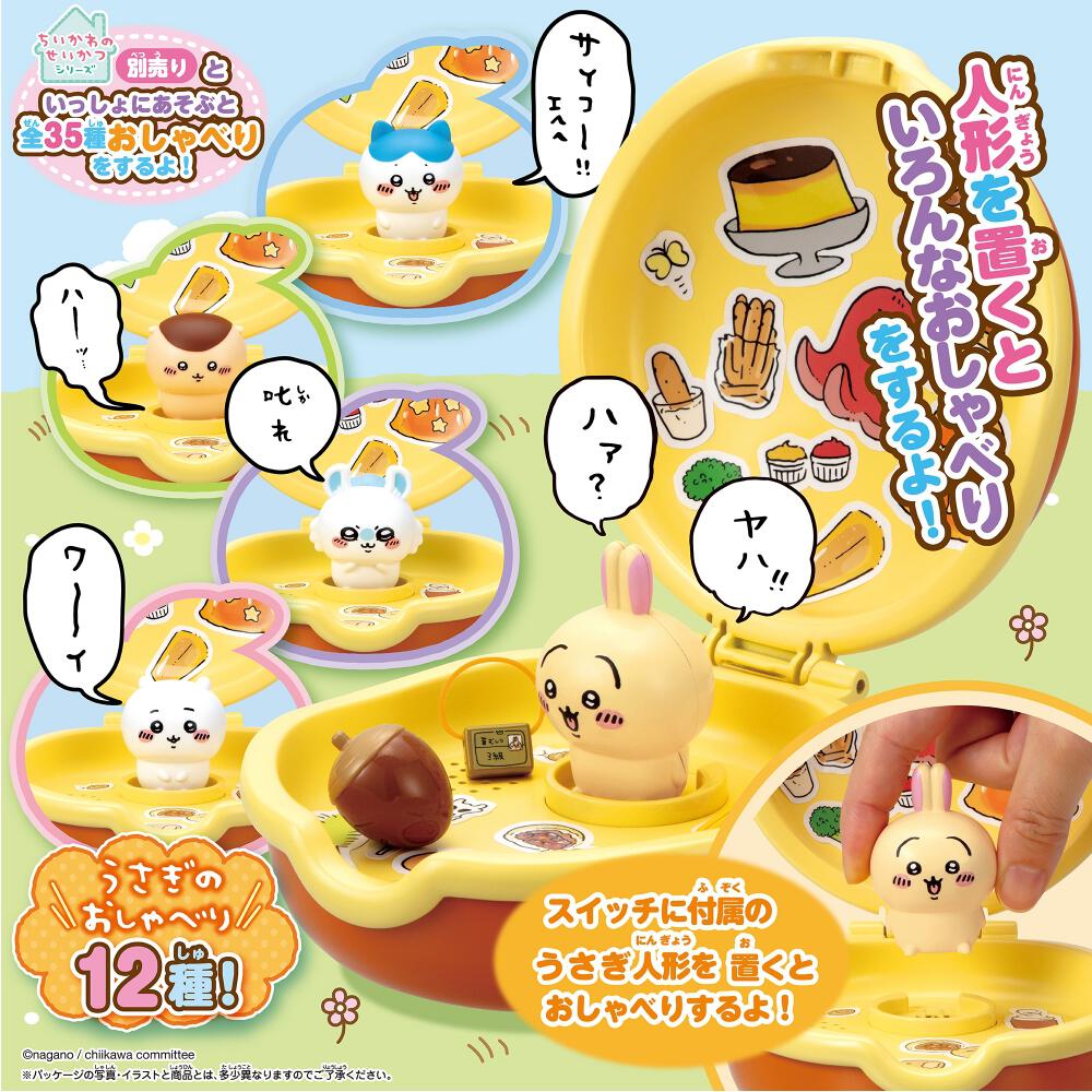 さらにシリーズ第1弾(別売り)の「ちいかわ ゆめのむちゃでかおしゃべりプリンハウス」や「ちいかわ なかまいっぱいセット」の人形をのせてもおしゃべりができるよ!別売りのシリーズ商品の人形の音声も含めると、本製品には全部で35種類の音声が収録されてるよ。