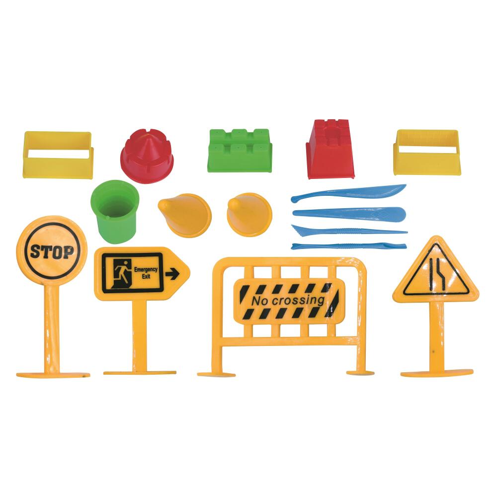工事現場プレイセットは、約1kgの砂と2台の工事車両と17個もの付属品が付いたプレイセット!