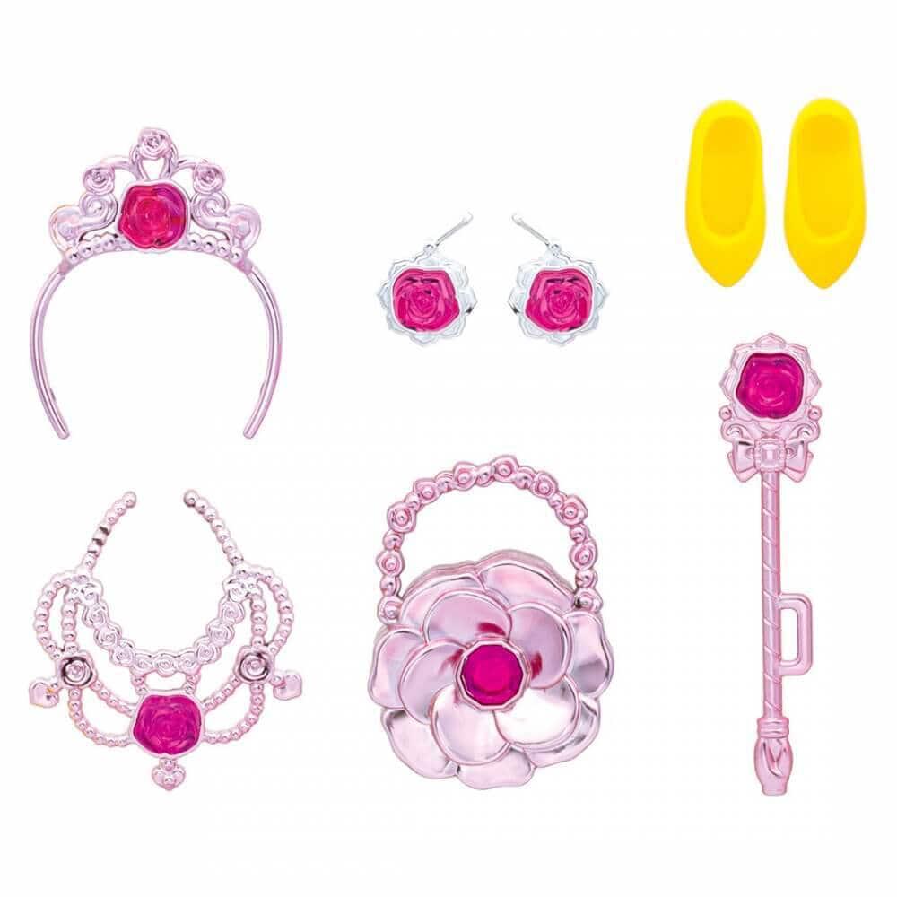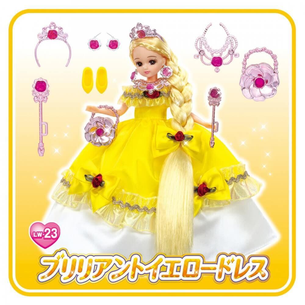 リカちゃんの黄色のプリンセスドレスです。ピンクメッキのアクセサリー付き。華やかなきらめきイエローのドレスセットです。キラキラのスカートは大きく広がり、リボンとローズのワンポイントがついています。ラインストーン付きのローズアクセサリー付きです。<セット内容>ドレス(1),ヘアーリボン(1),ローズイヤリング(1),ローズティアラ(1),ローズネックレス(1),フラワーバッグ(1),ローズステッキ(1),クツ(1)※人形は別売りです。