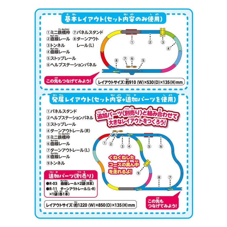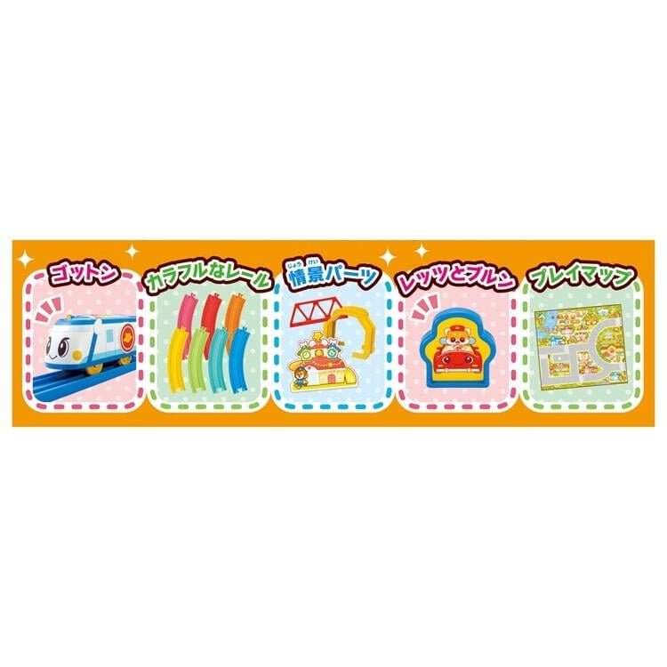 ゴットン(動力車)(1),客車(1),ミニ鉄橋枠(2),トンネル(1),ストップレール(1),ターンアウトレール(L)(1),直線レール(3),曲線レール(7),パネルスタンド(2),人形(1),ヘルプステーションパネル(1),プレイマップ(1),プレイカード(3)
