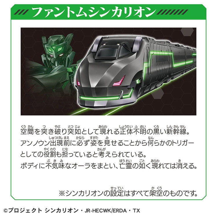 テレビアニメ「シンカリオン チェンジ ザ ワールド」から『ファントムシンカリオン』が3両編成シリーズに登場!3両編成で電動走行し、連結して遊ぶこともできる!■『ファントムシンカリオン』がモデル■別売の連結仕様の車両と連結して、長編成にして走らせることが可能■3両編成でそれぞれ連結・切り離し可能■2スピードで電動走行、スイッチOFFで手転がし遊びが可能※レールは付属しません。<セット内容>車両本体(1),部品注文書(1)