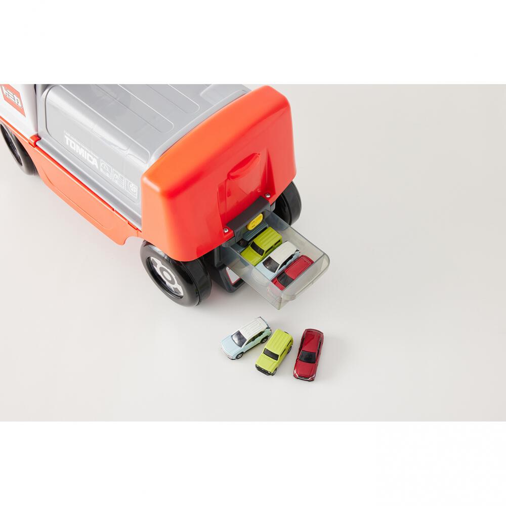 2)フタをパカっとオープンするだけで、ピットとコースが登場!すぐにトミカで遊べます。
