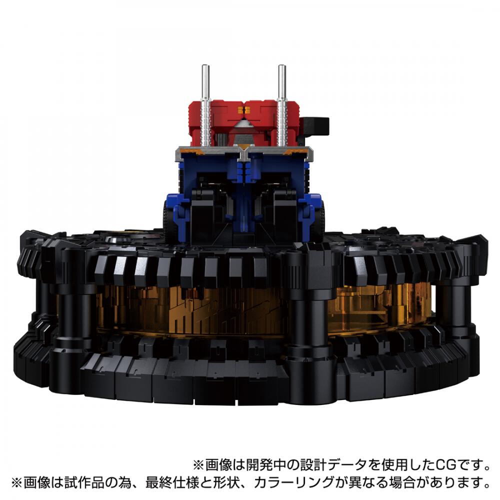 ボタンを長押しで、「サイバトロン戦士、トランスフォーム!」の声とともに台座中央が回転し、コンボイが立ち上がりながら変形し、