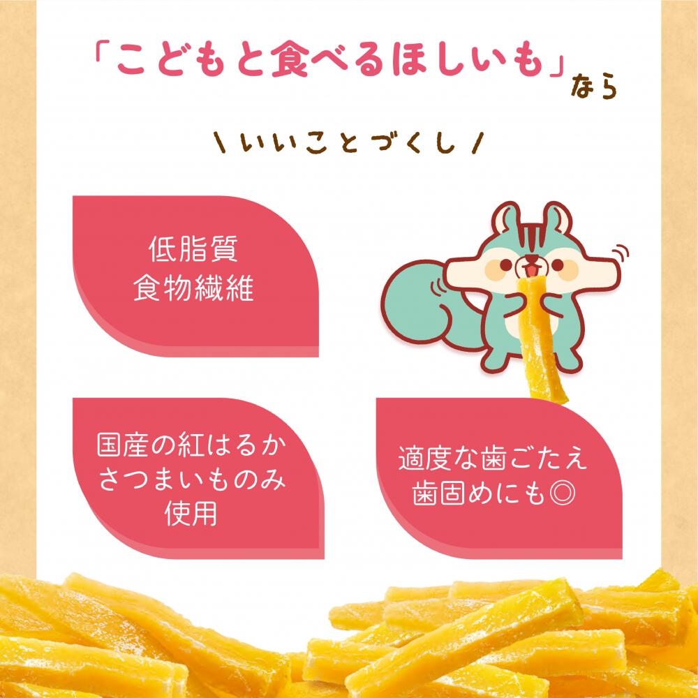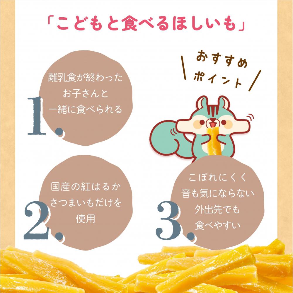 国産の干し芋は低脂質で、自然な甘さの安心安全なおやつとしてぴったり。ぽろぽろこぼれにくくつかみやすいスティックタイプなので、お子さんと一緒に食べるおやつに最適です。