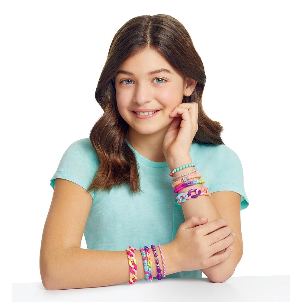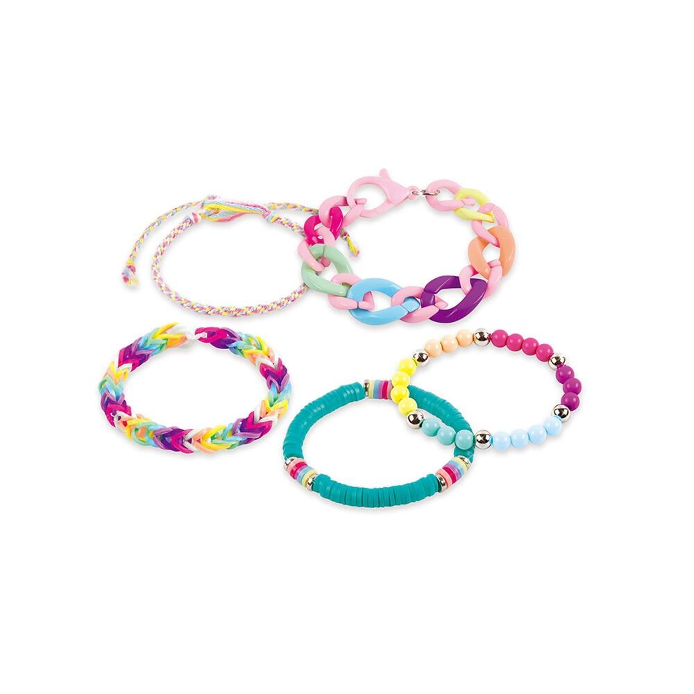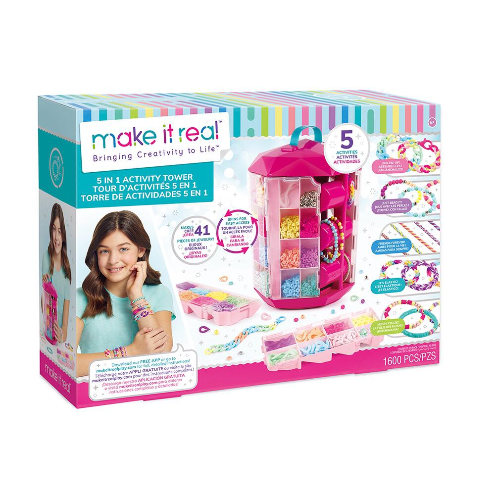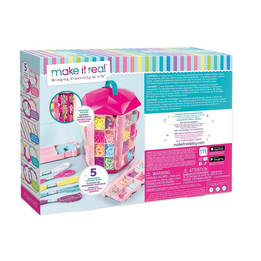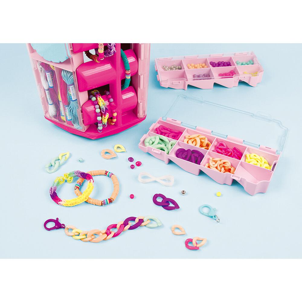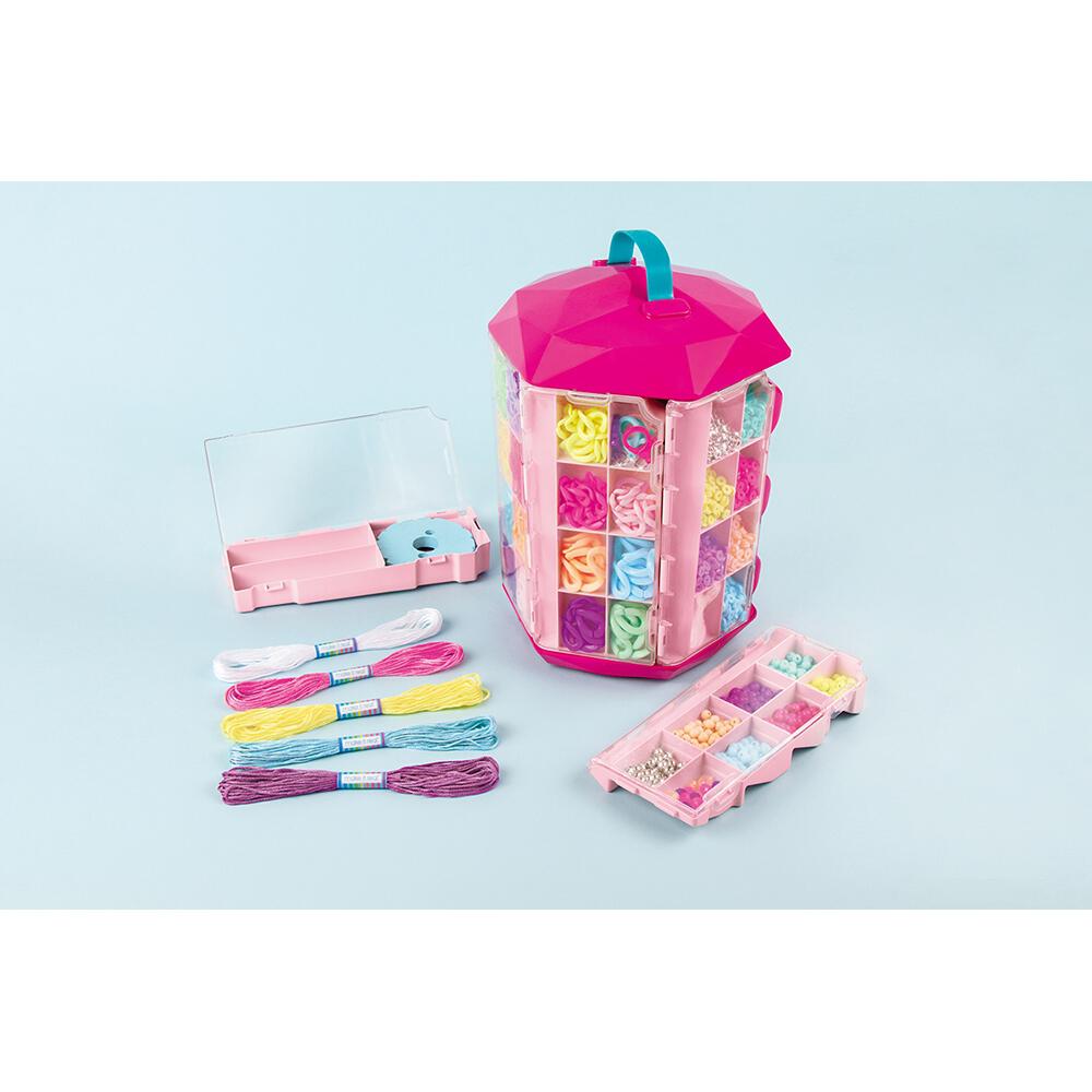 <セット内容>アクティビティタワーx1、丸カン付ロブスタークラスプx5、ゴム紐x2、円盤x1、刺繍糸x5色、パターンホルダーx1、カラフルリンクx77、宝石カットビーズx20、ミニ輪ゴムx400、丸ビーズx412、ヘイシービーズx675、取扱説明書x1