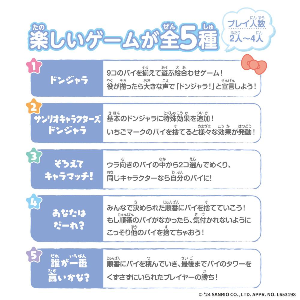 基本のドンジャラから、「サンリオキャラクターズ」の世界観を楽しめる特別ルールのゲームまで、2人から遊べるゲームを5種収録。かわいいサンリオキャラクターズの絵柄でたくさん遊ぶことができます!