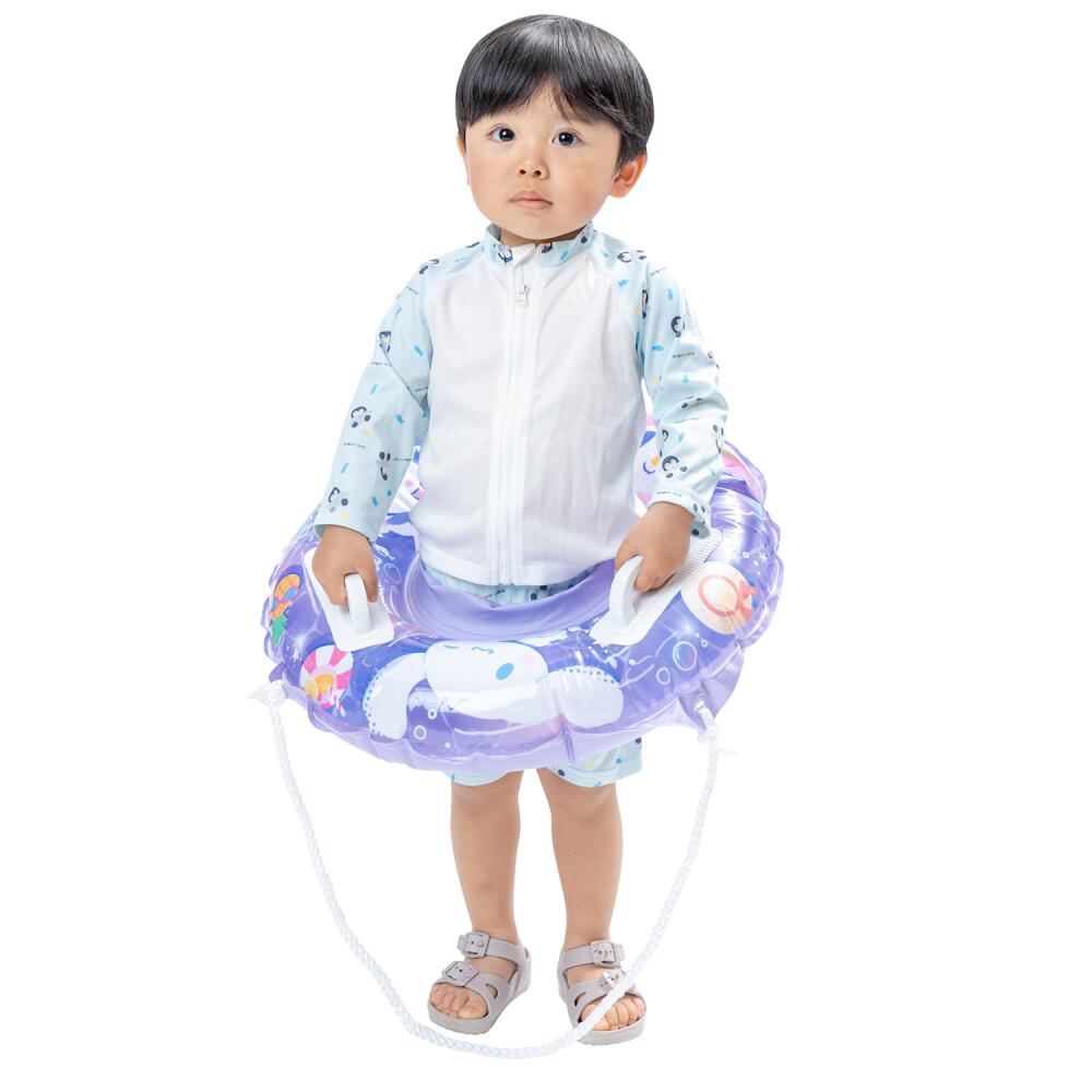 浮き輪に足を入れる部分がついていて、座って使用するので、