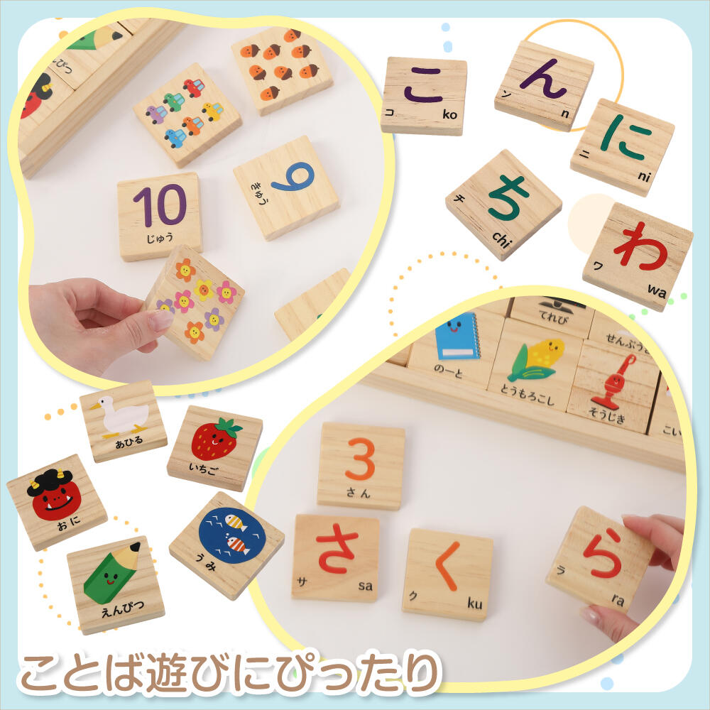 ブロックの両面にイラストや文字・数字が描かれていて、ひらがなや数字の勉強にぴったり!